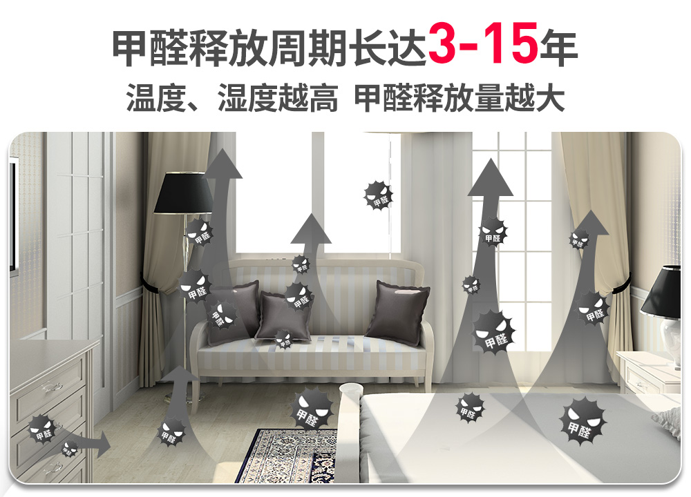 甲醛的一個特性,決定了治理它遠不是簡單的小事一件,可以說,如果甲醛是個人的話,人們一說除甲醛,甲醛就笑了。各類除甲醛產品、各式的除甲醛方法、除甲醛妙招,在甲醛面前各有各的力不從心。這個特性就是:第一,污染源釋放甲醛的時間非常長,長達3~15年;第二,甲醛喜仗高溫、高濕之勢,就像山火借了夏風的勢,一發不可收拾,新房在前幾年,每年都會反復多次籠罩在中重度超標的甲醛之中。